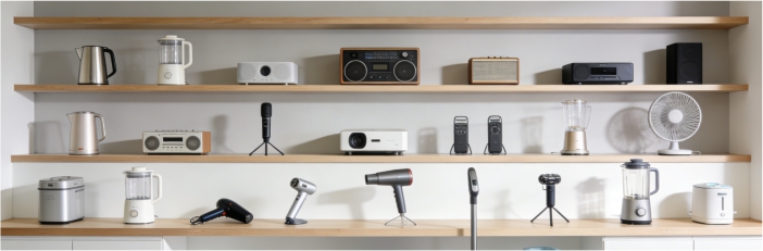 厨房电器、音响、收音机、麦克风、投影仪、电风扇、电动剃须刀、电水壶、榨汁机、吹风机、扫地机器人、洗地机、蒸汽斗、加湿器等